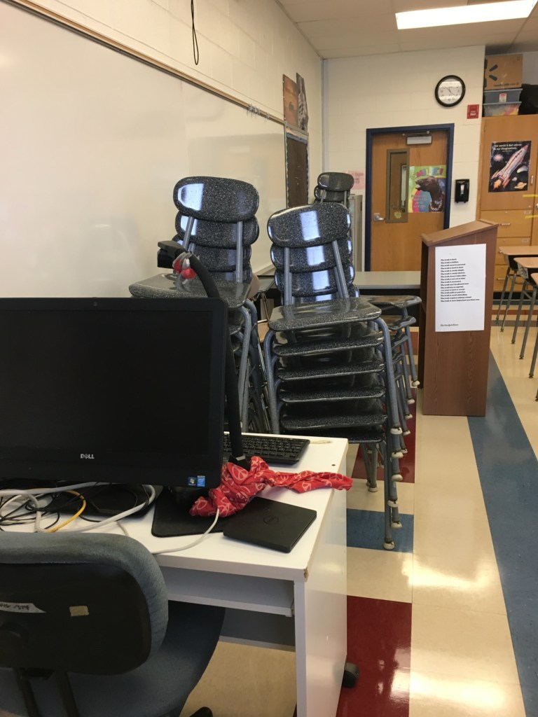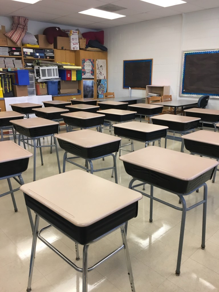 In the middle of the room, the desks – too many? not enough? – in rows, organized by a well-meaning custodian. (As we know, rows are not part of education these days, in most classrooms; I only put my desks into rows during standardized testing.) On the other side of the room, the corresponding chairs were not just stacked together but stuck, three and four high. The desks appeared glued to the floor, the wax holding them in its grip.